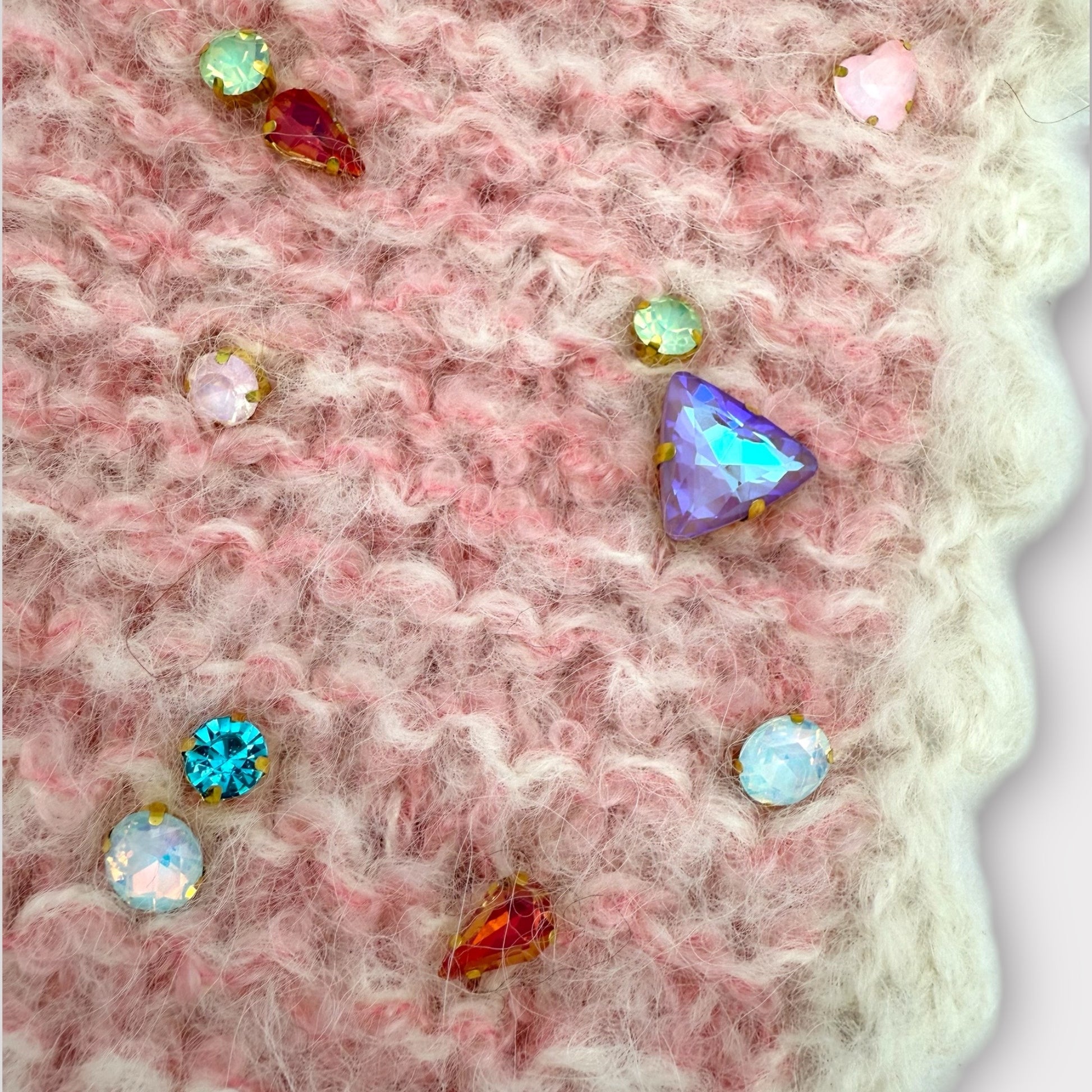 Hand knitted from soft pink and ivory alpaca & silk yarn, Gem is adorned with pretty multicoloured diamantes and finished with lovely long ivory ties. She's a neat little thing, slightly smaller than our usual bonnets, she's designed to sit just in front of your ears for a cute mini look that frames your face beautifully.