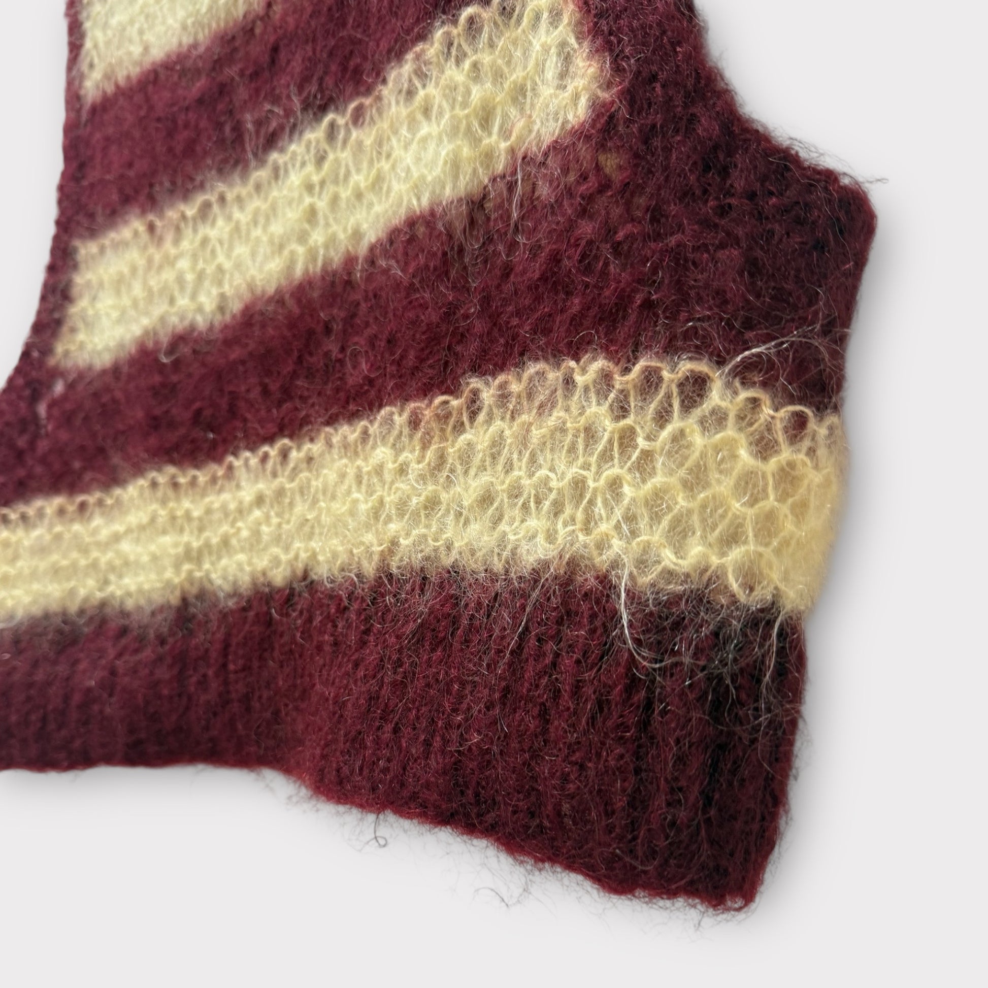 Jackie is hand knitted in rich wine and lemon yellow mohair, alpaca and silk yarn. She look great over a shirt or tee and paired with jeans.