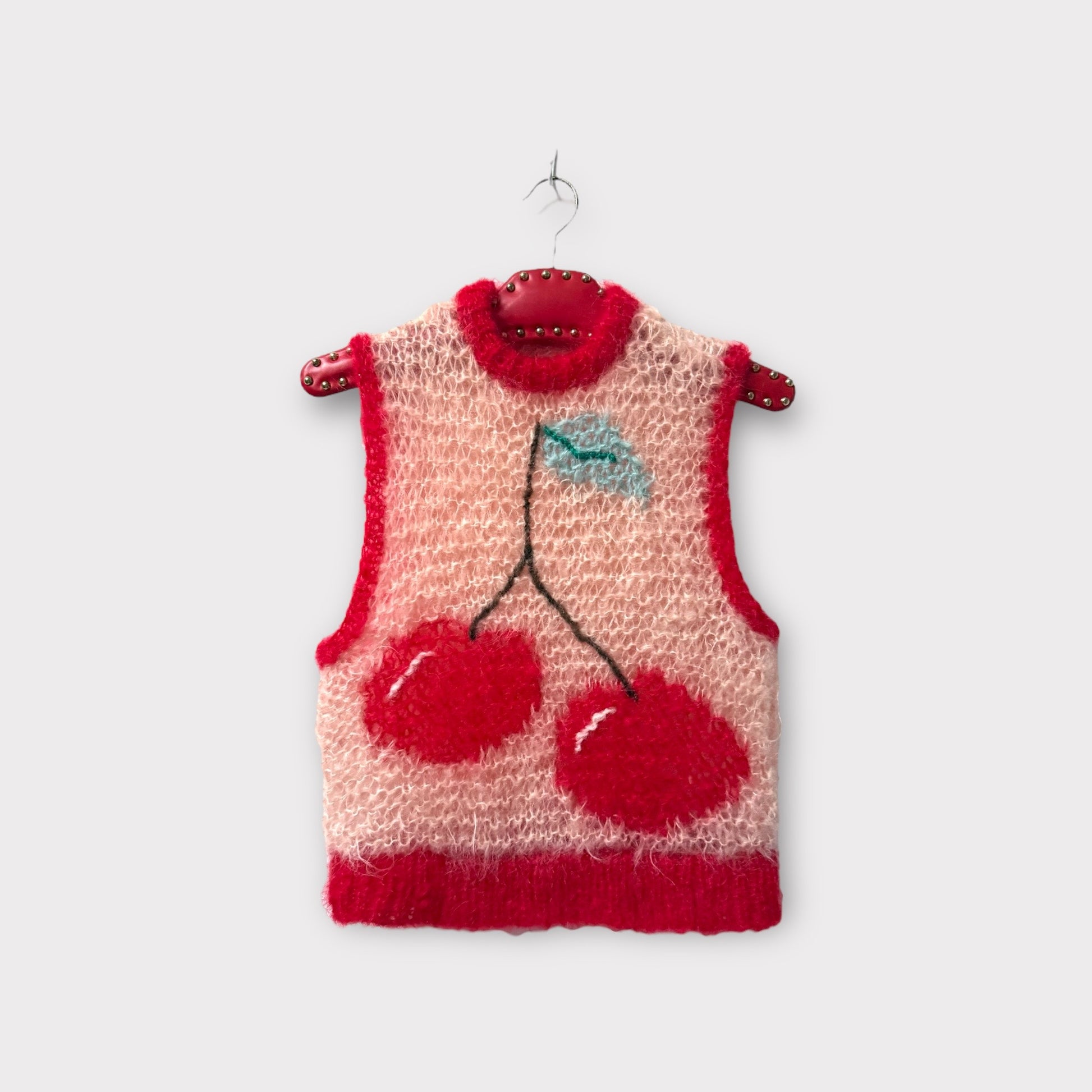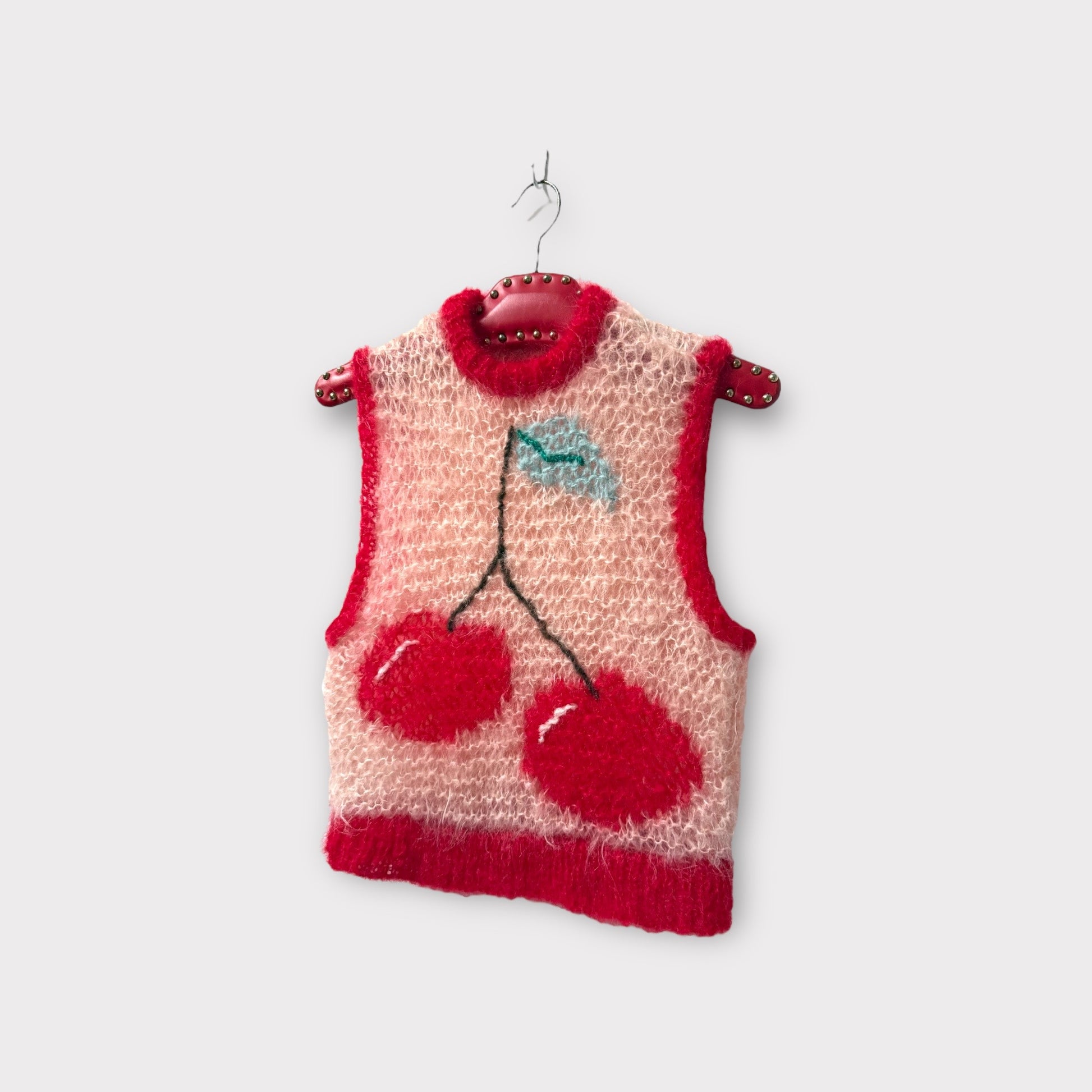 Cherry is hand knitted in pretty peach and red mohair, alpaca and silk yarn. She features intarsia & embroidered cherries. Cherry looks great over a shirt or tee and paired with jeans.