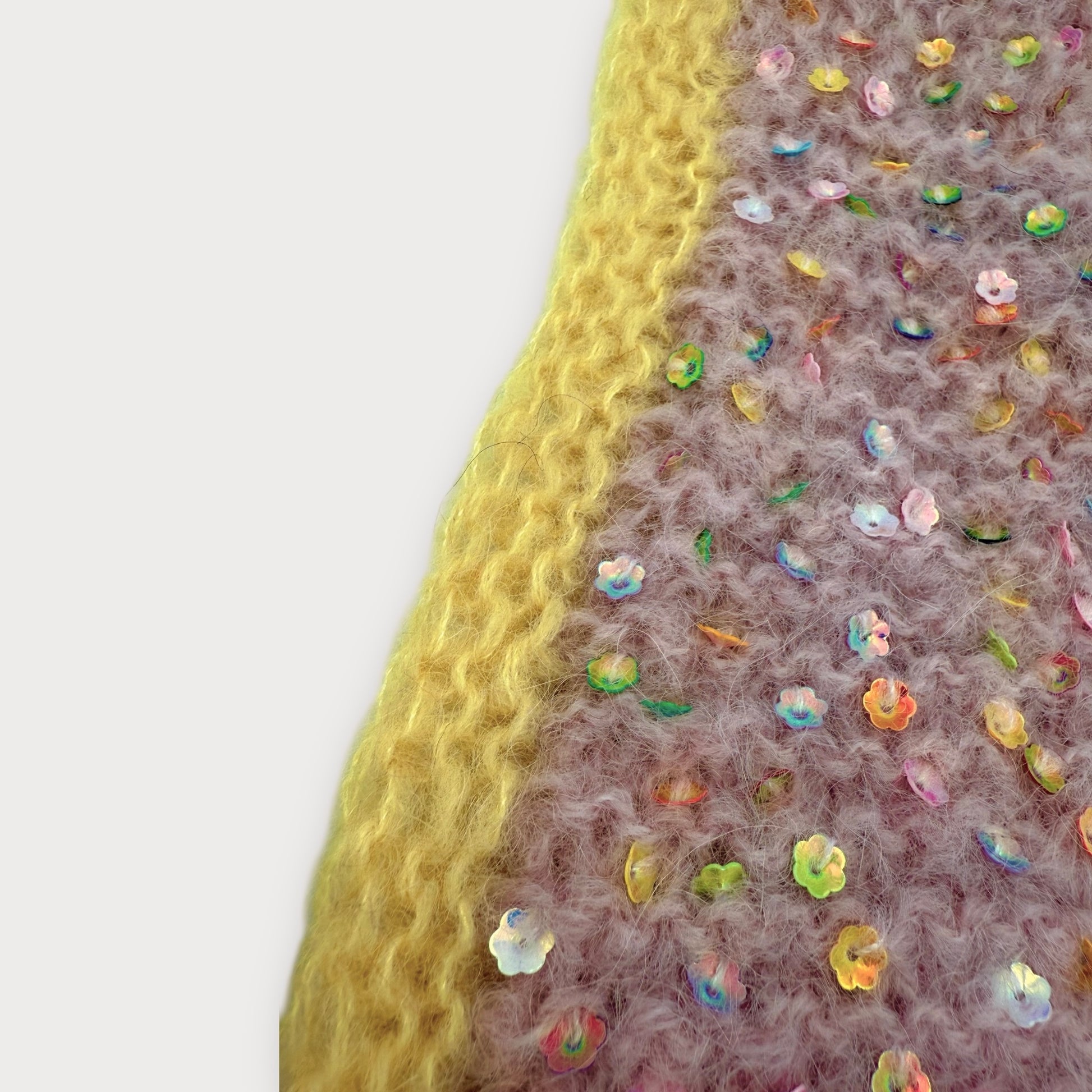 Hand knitted from the softest alpaca and silk yarn, Myrtle is adorned with delicate sequin flowers and finished with a soft lemon trim.